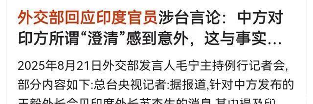 三、中国的回复 考虑到王毅外长正和巴铁谈话,也没办法飞回新德里,所以,在8月21日, 中国外交部发言人毛宁,在例行记者会上,针对印度的不当言行做出了回应, 毛宁表示中方对印方所谓“澄清”感到意外,看来印度国内某些人试图在台湾问题上损害中国主权,破对中印关系的改善,中方对此表示严重关切和坚决反对。