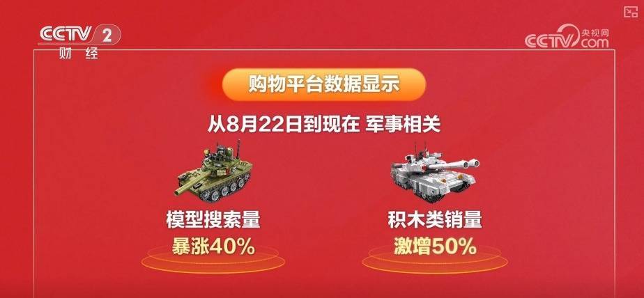 阅兵带来的远不止这些,打开购物网站,辽宁舰、歼20模型广受到热捧!购物平台数据显示,从8月22日到现在,军事模型搜索量暴涨40%,积木类销量激增50%。