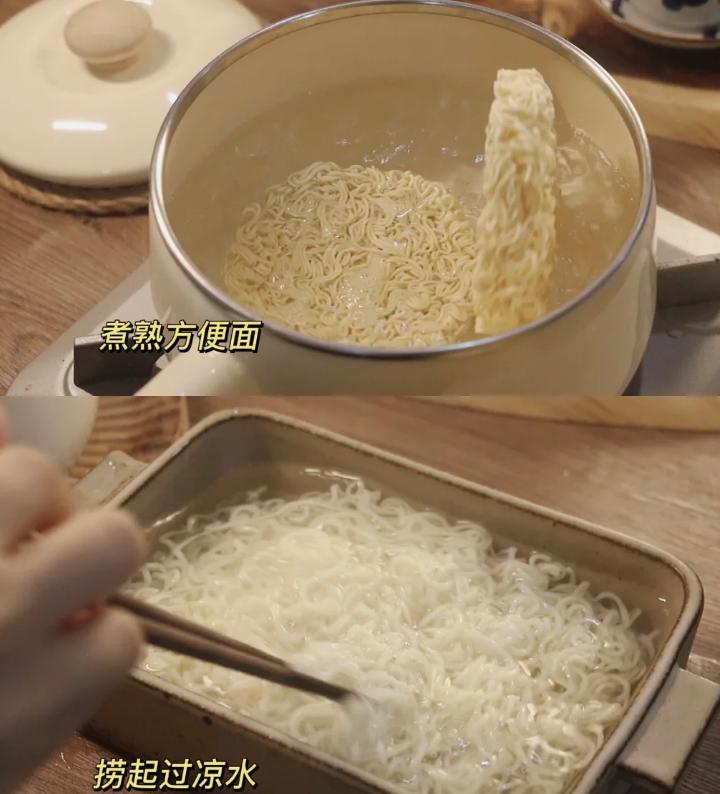 煮面的时候,方便面不要煮的太软,煮完之后需要过一下凉水,这样拌面更清爽。