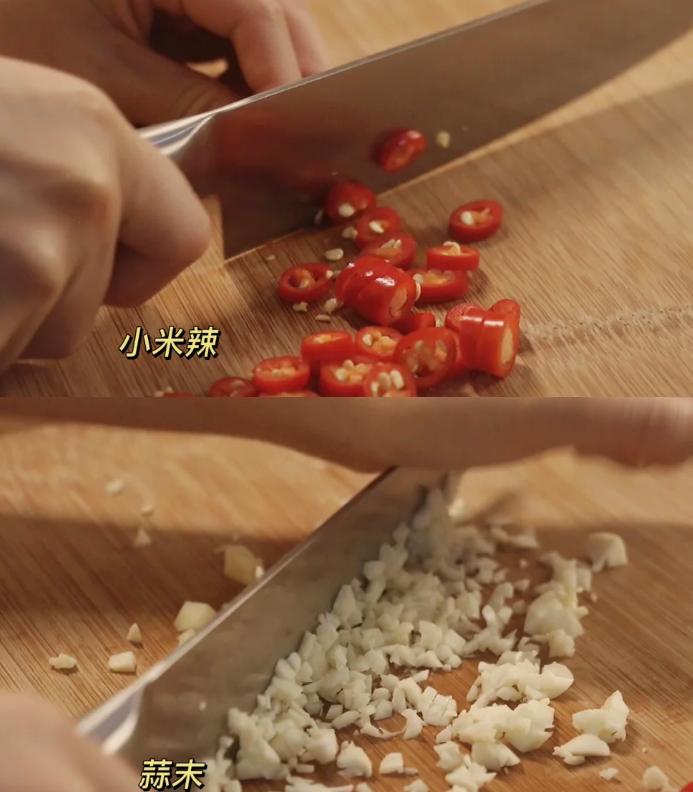 先把小米辣和蒜切成末,如果不能吃辣的话,就少放一些小米辣。